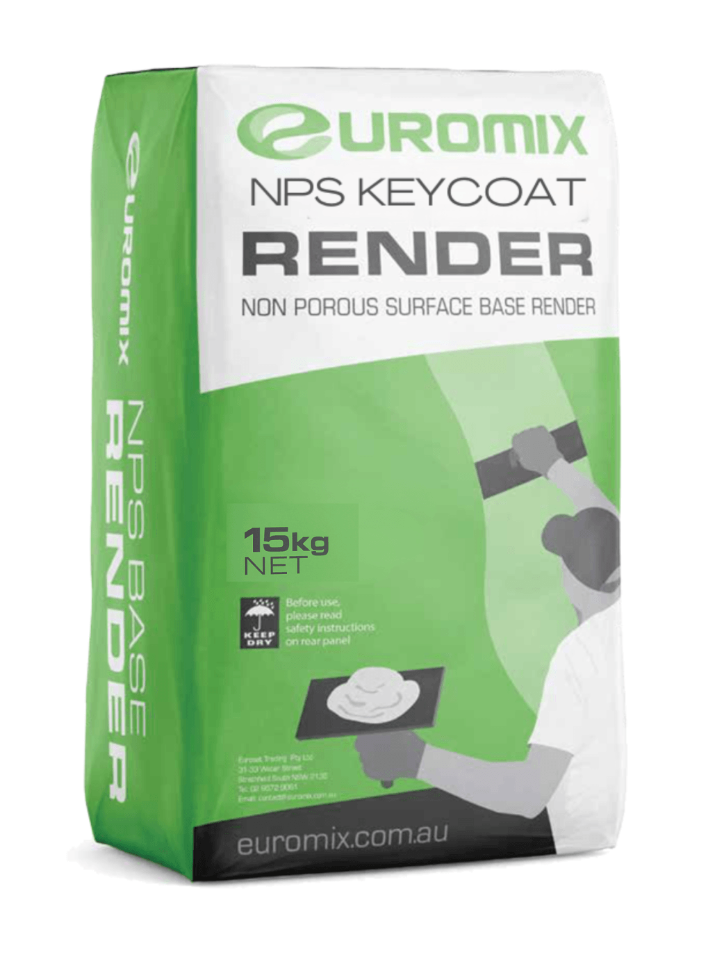 Euromix™ NPS Base Render is a dry mix, full polymer, cement based render formulated for application over non porous sheet and panel substrates, like, autoclaved aerated concrete (AAC), expanded polystyrene (EPS), fibre cement (FC) and plaster based materials. Euromix™ NPS Base Render is mixed with water only (no added Bond).